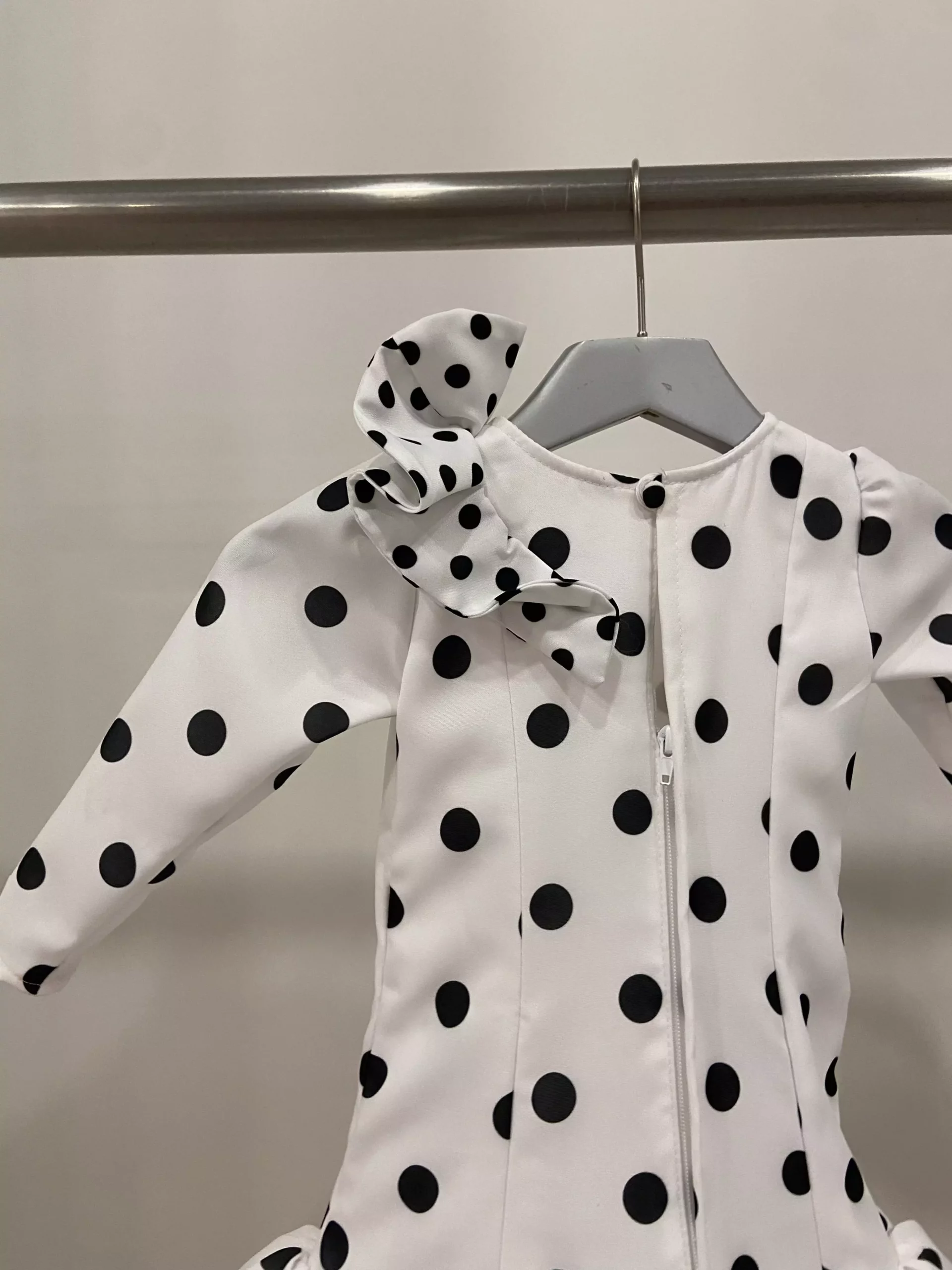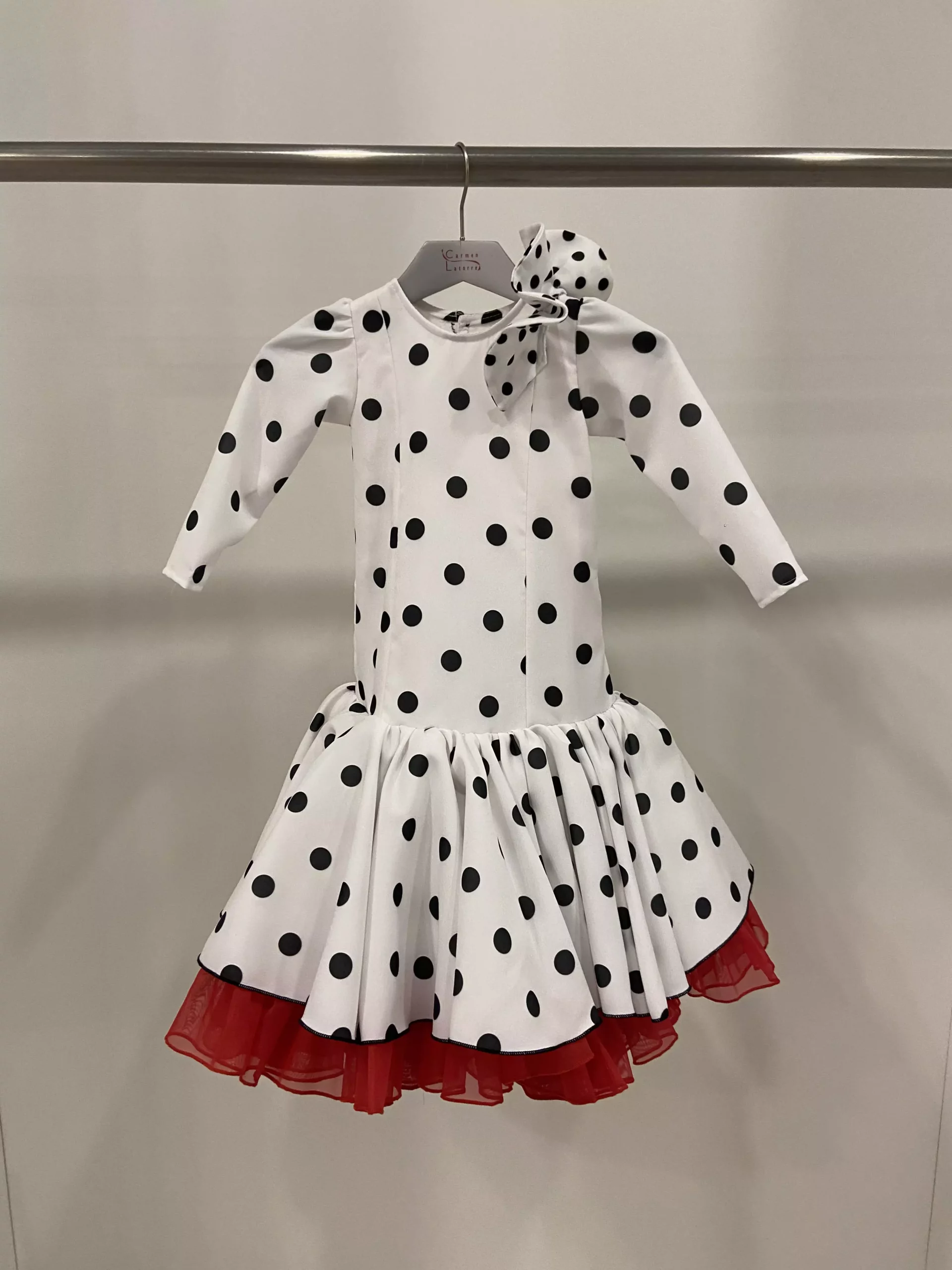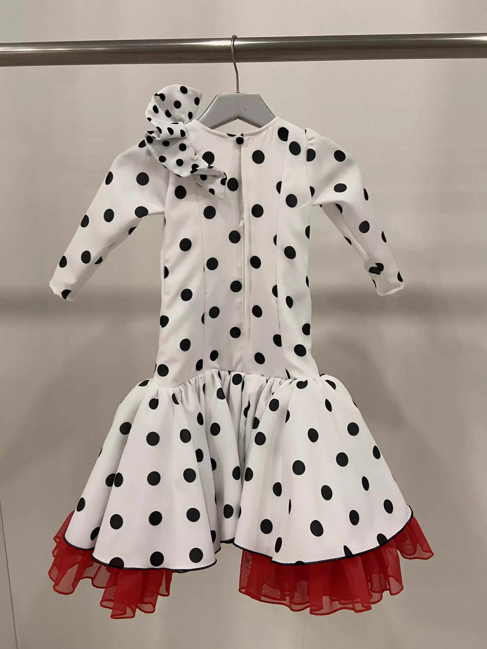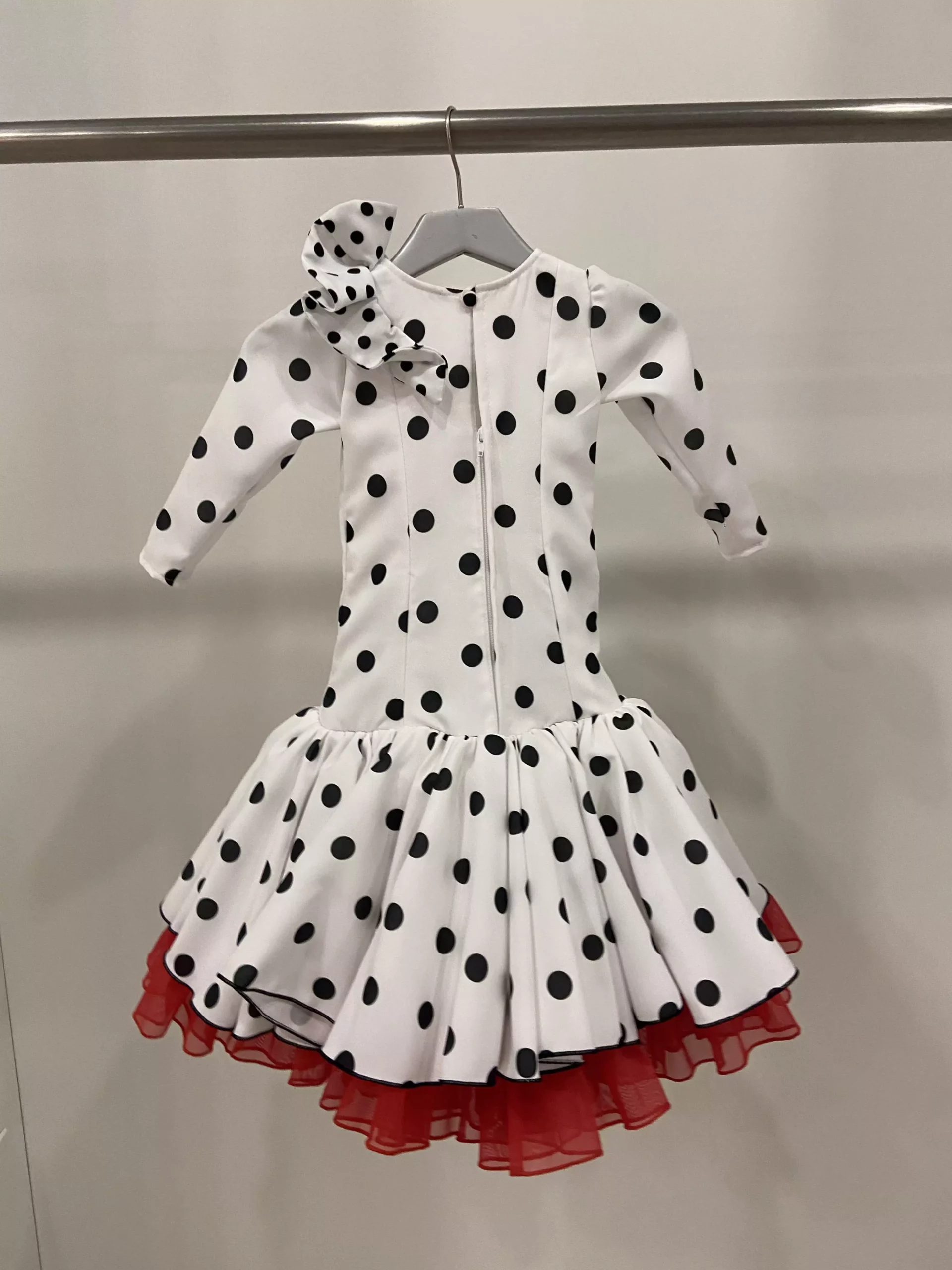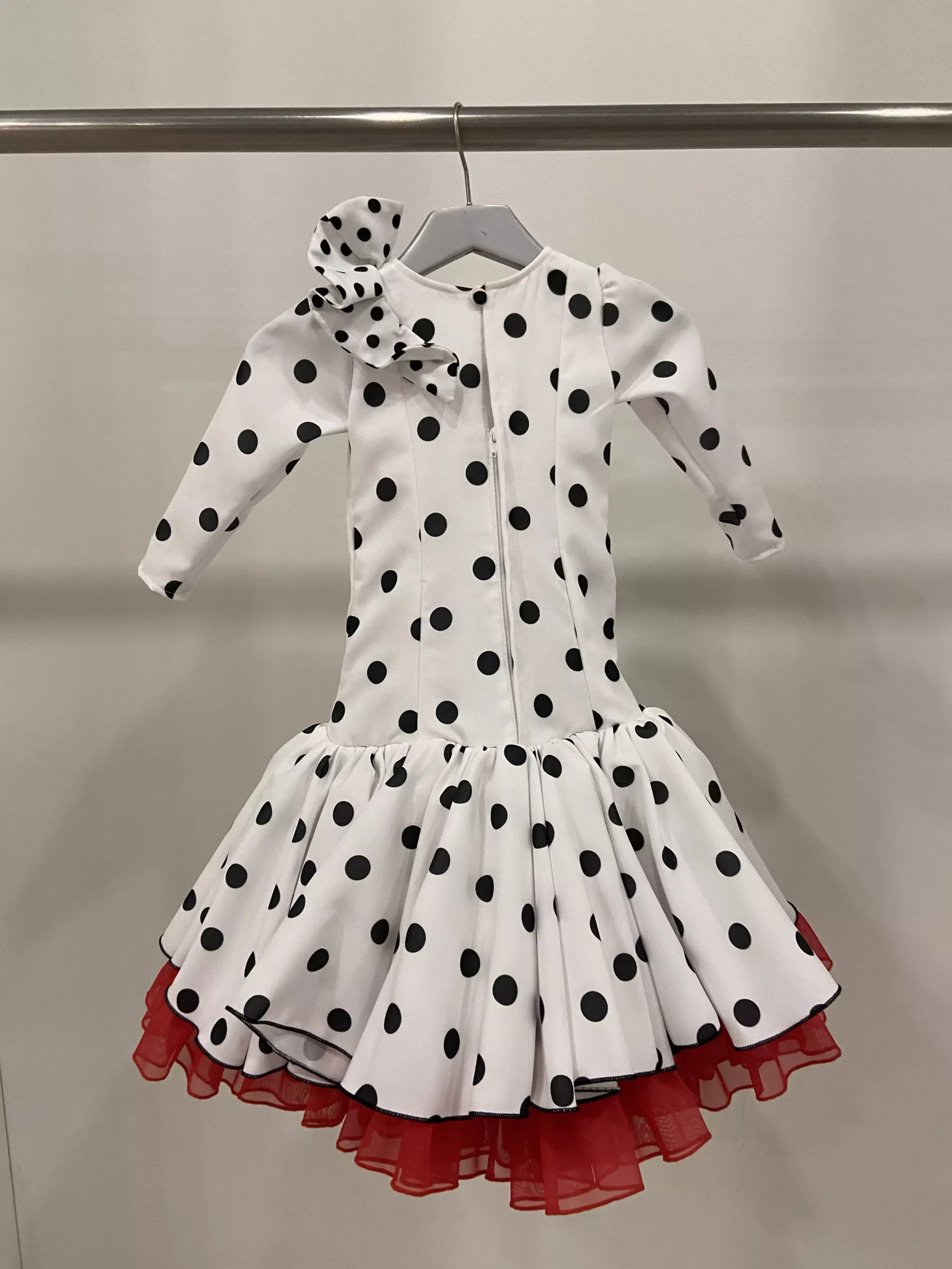 Stres blanco lunar negro con enagua roja de volumen y volante de media luna en el hombro