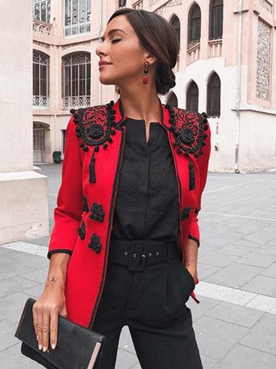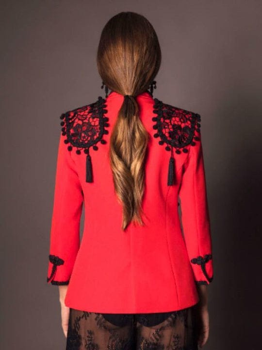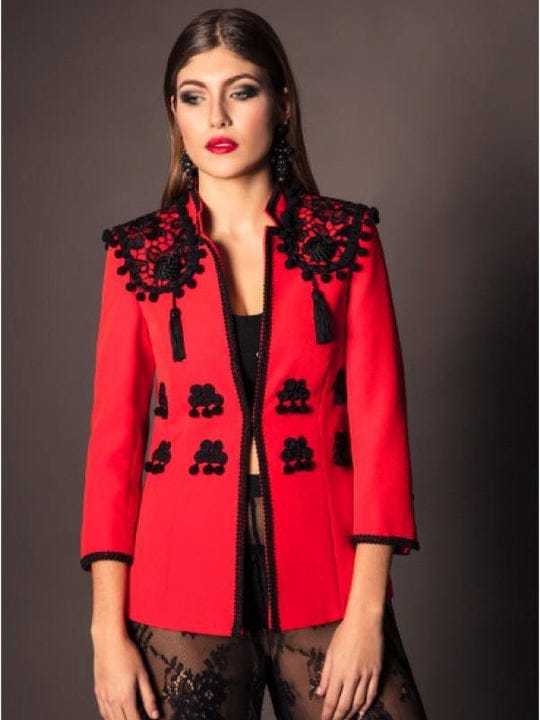 Chaqueta en rojo, manga tres cuartos. Las hombreras se crean desde cero basadas en un diseño exclusivo de la firma. Tanto la creación de las hombreras como la colocación de todas las aplicaciones se realiza a mano. Utilizamos un patrón propio, diseñado para sentar bien. Como todas nuestras Bullinas ha sido creada para brindar distinción y buen gusto.
