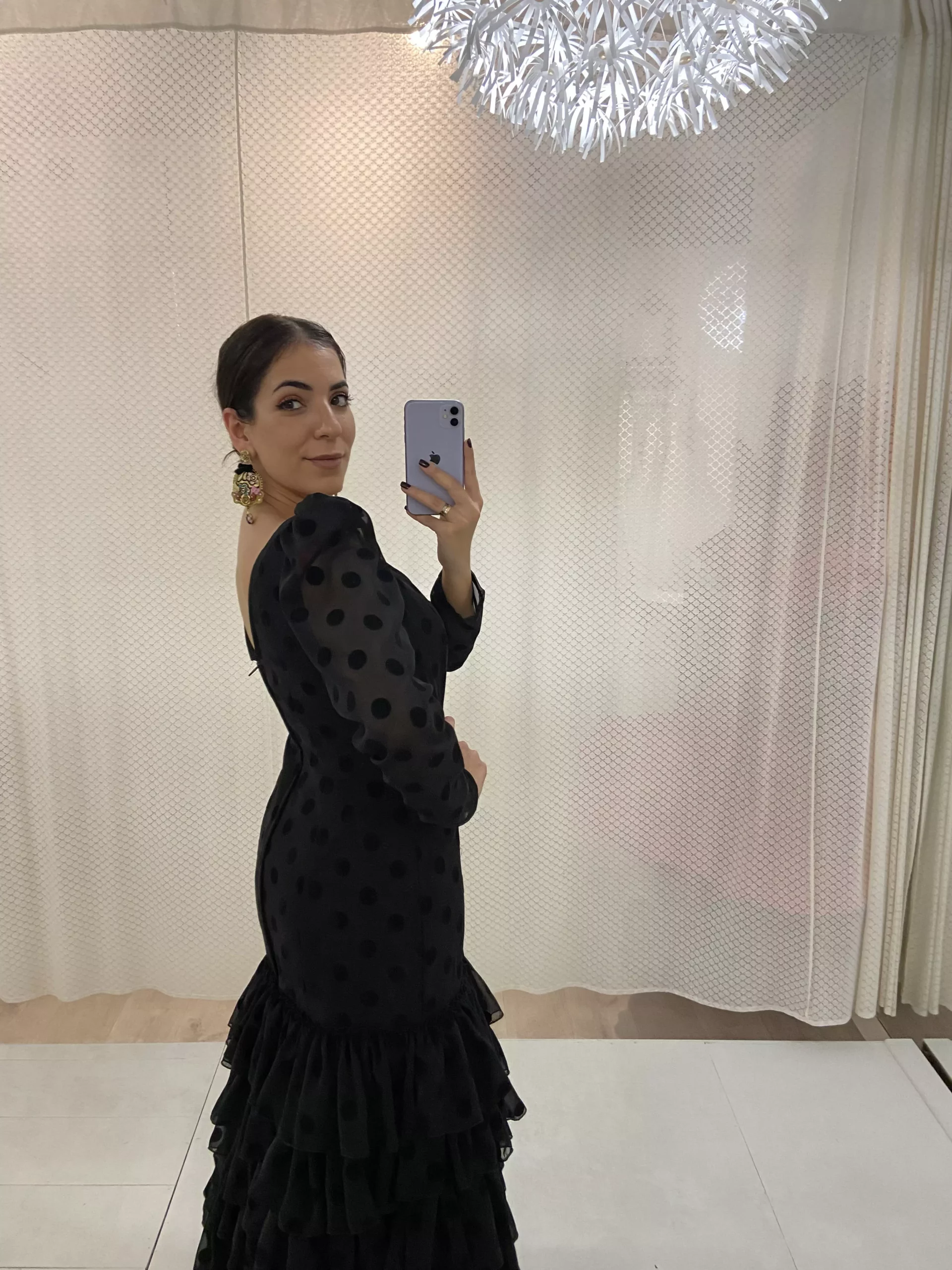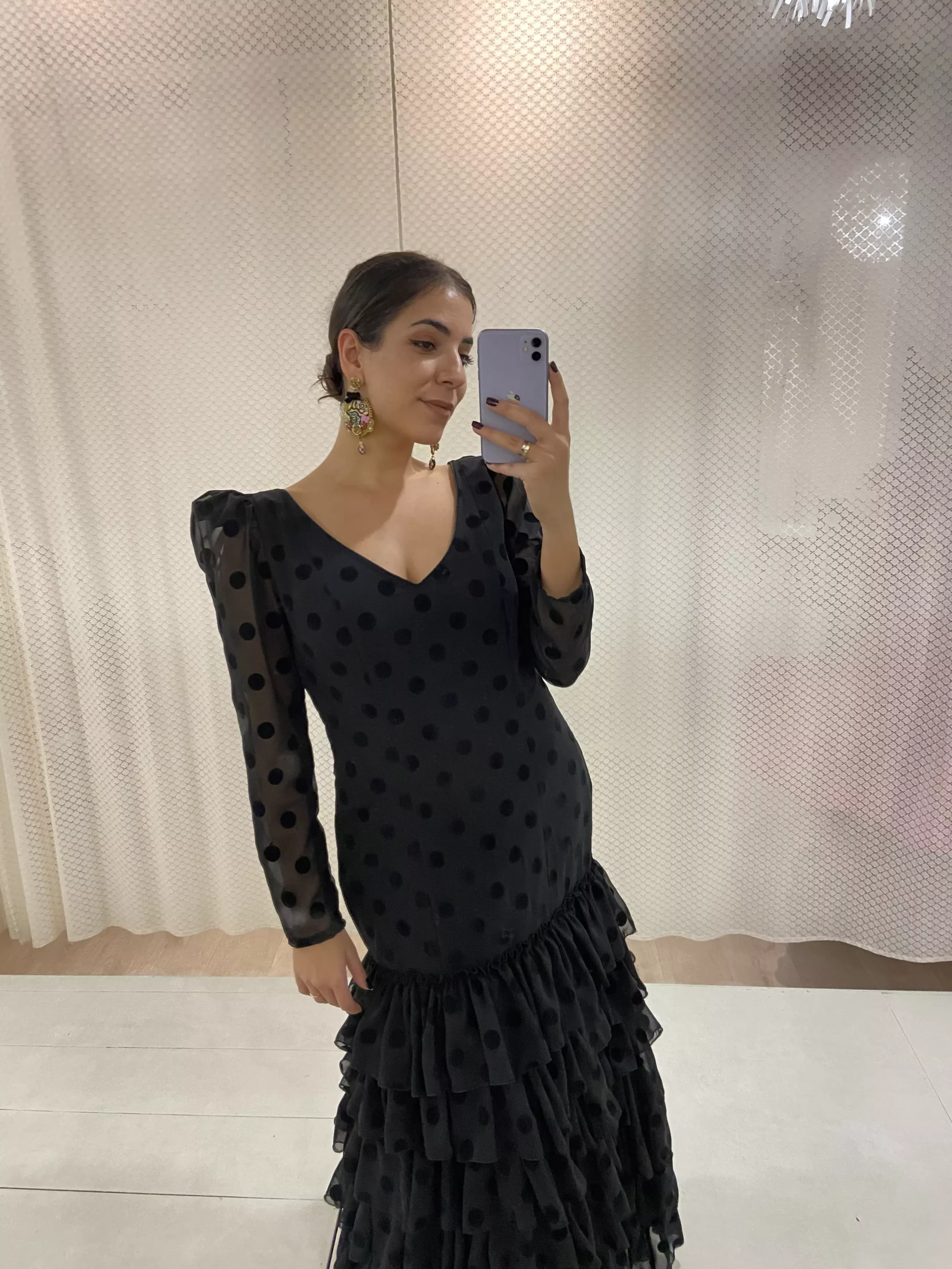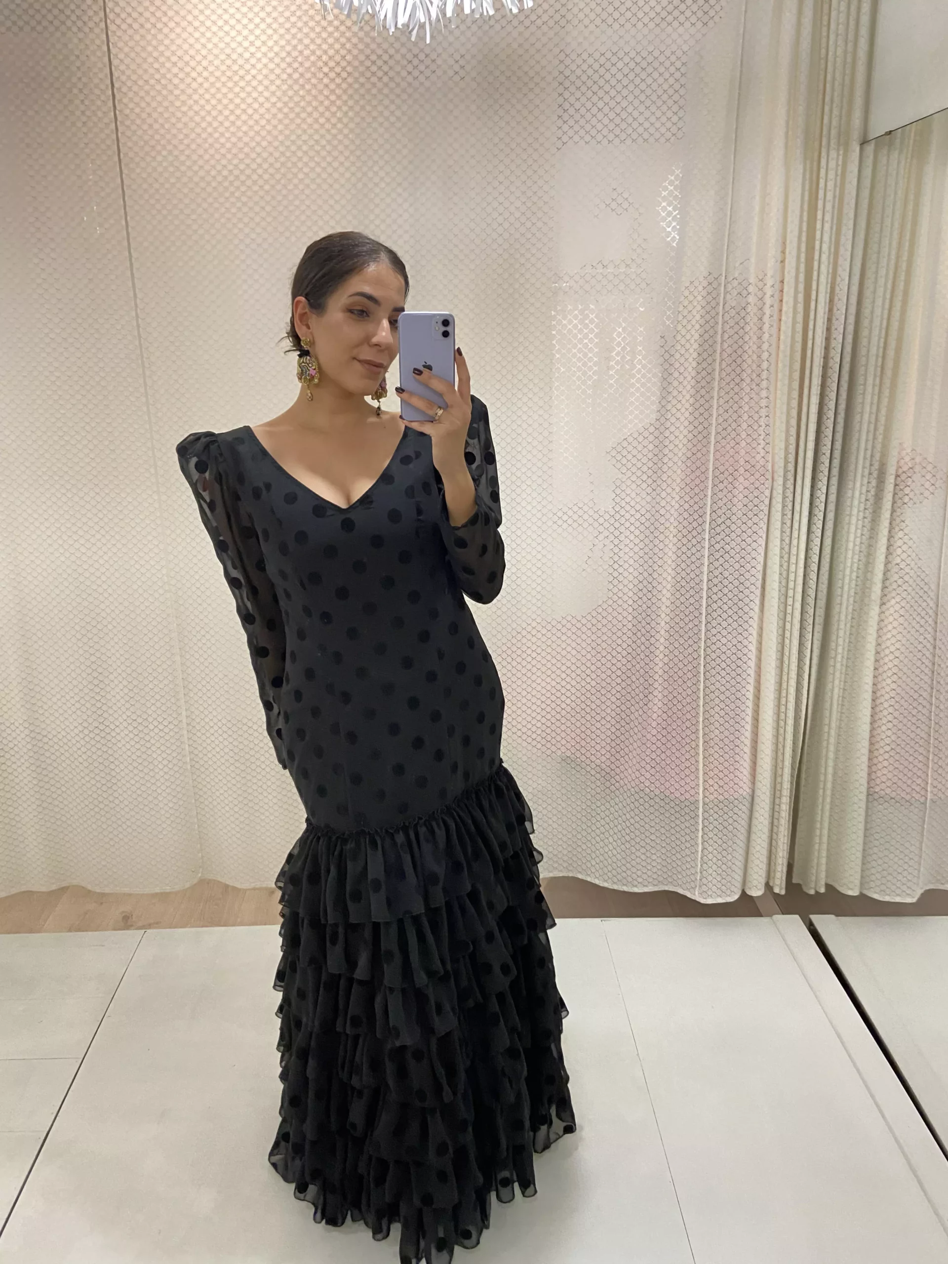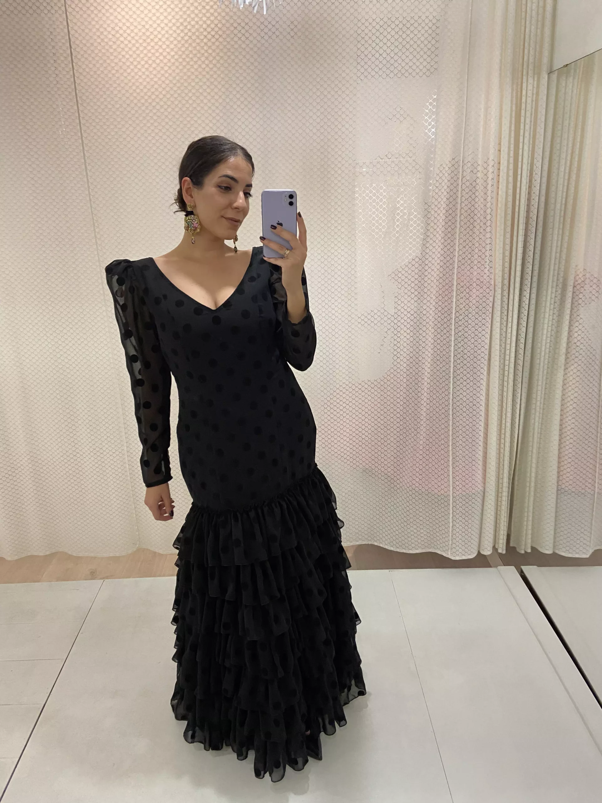 Traje de flamenca con cinco volantes al hilo, en gasa con lunar de terciopelo