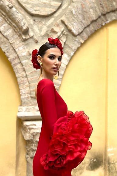 Vestido Flamenca con diseño de silueta ceñida, escotes delantero y trasero en pico. Falda y mangas con volate de capa, carrucha y volumen XL